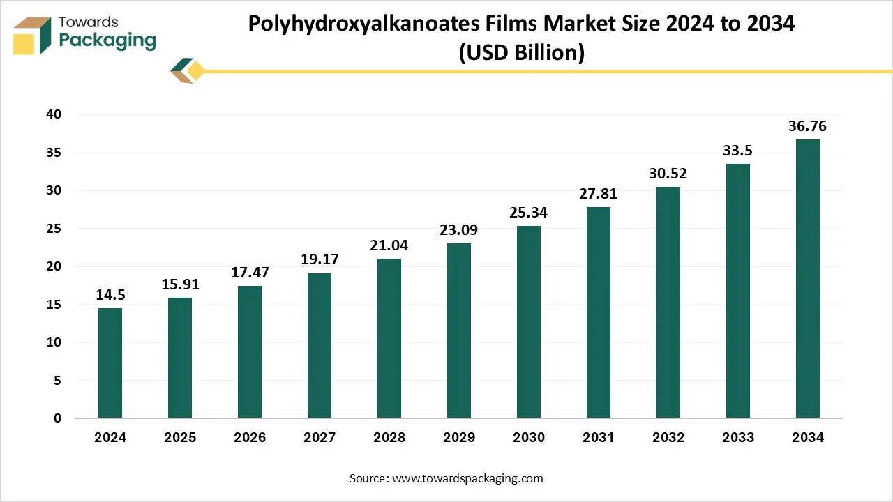 According to Towards Packaging consultants, the global polyhydroxyalkanoates films market is projected to reach approximately USD 36.76 billion by 2034, increasing from USD 17.47 billion in 2026, at a CAGR of 9.75% during the forecast period 2025 to 2034.